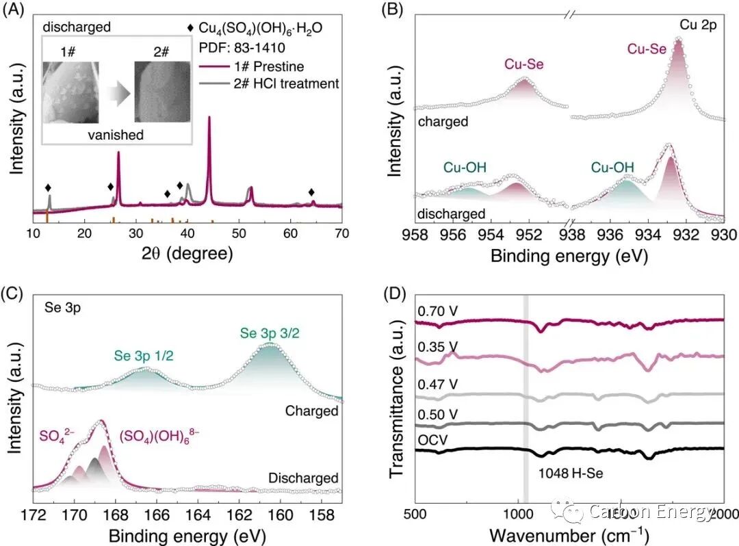 ▲图 1A、B 展示了在不同(放电)充电状态下收集的 CuSe 的原位 XRD 图案以及导数 dQ/dV 曲线。相演化揭示了在充放电过程中从 CuSe 到 Cu2Se 的逐步可逆转化,并形成 Cu3Se2 和 Cu1.8Se 的中间相。