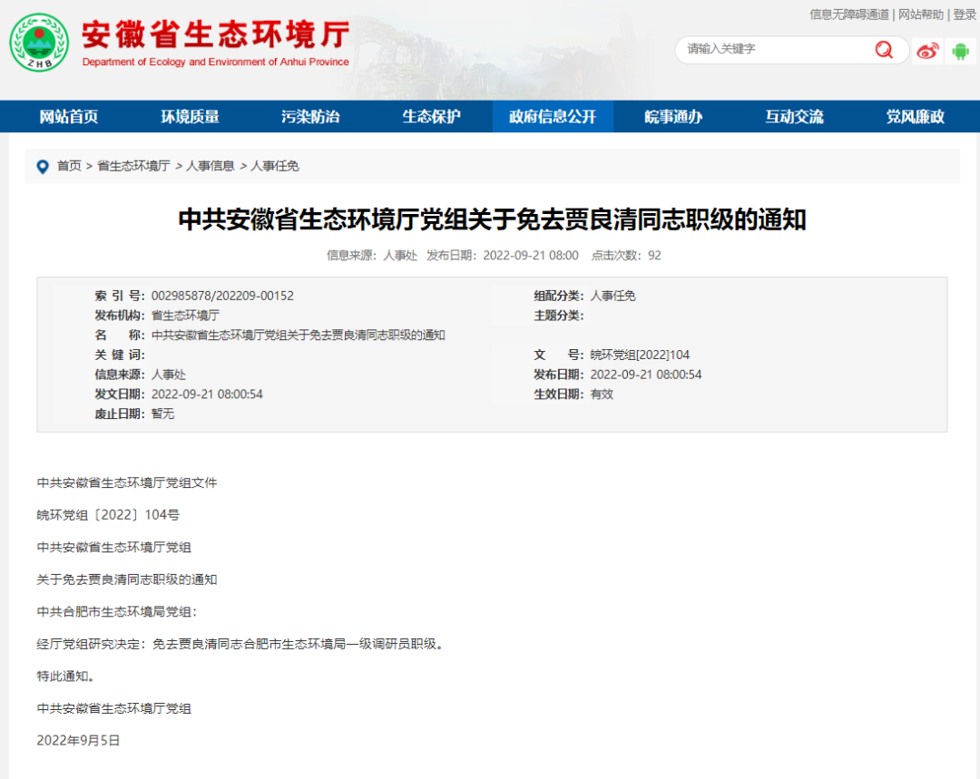 9月21日安徽省生态环境厅党组发布关于免去贾良清同志职级的通知,经厅党组研究决定:免去贾良清同志合肥市生态环境局一级调研员职级。