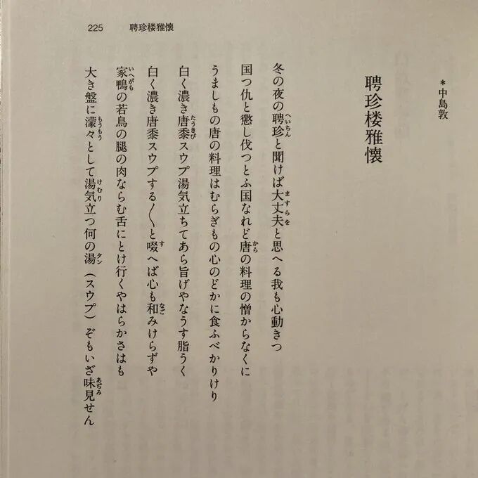 聘珍楼由当时的赴日华侨创立,主营粤菜。“聘珍”二字源于《礼记》的“儒有席上之珍以待聘”,指拥有美好德行的人犹如陈列席上的山珍海味一般等待被发现和赏识;作为饭店名,一语双关。在快餐文化盛行的今天,聘珍楼仍维持着登陆日本时高级餐厅的传统,选用新鲜的时令食材,拒绝化学添加剂和复合调味品;在口味传统且挑剔的日本食客心中,一直占据着一席之地。上世纪前半期,横滨圈出了一批日本文豪,这些浪漫主义者大多反感现实政治,对海对岸的中国怀抱款款深情。他们中不少是聘珍楼的座上客:喜爱中国菜的谷崎润一郎在正月的夜晚“整顿好一切”后就要去那里放松心情;中岛敦写过14首短歌咏诵聘珍楼的料理,其中如明炉烤鸭、糖醋里脊、玉米靓汤等菜式在近一百年后的今天仍能点到。中岛敦短歌《聘珍楼雅懐十四首》节选,收录于《書物の王国14『美食』》百年来坚持提供同样的菜式,维持同样的经营模式,这既打造了聘珍楼稳定的品牌形象,也在今天成为一柄双刃剑。根据帝国数据库的调查,聘珍楼在2007年一度创下近108亿日元的营业额高峰,但高成本体质之下的转型困难,也成为了其经营不善的重要原因。在聘珍楼发布的公告,以及大多日本媒体的看法中,聘珍楼横滨总店负债3亿日元并申请破产,与两年多的新冠疫情有很大关系。根据NHK报道,聘珍楼的破产清算律师称,疫情以来,商务宴会和多人餐饮数量骤减,给聘珍楼这样依赖此类模式营收的高级饭店带来极大冲击。根据日本智库东京商工调研4月的最新数据,即便领到日本政府颁发的补贴,由于疫情影响而申请破产的企业的数量仍在不断增加;2021年度,日本“疫情破产”企业数达到2020年度的1.5倍。此外,疫情前,横滨中华街发展协会协同组的加盟店数量为410家;到了2021年3月,短短一年,已经撤走50余家。不过,日本也有不少业内人士认为,疫情不过是近因;毕竟对于高级餐饮企业的融资能力而言,区区3亿日元(约1500万人民币)的负债并不足以让其关门,况且还是在日本防疫氛围淡化、社会逐步恢复日常生活的今天。或许,高级中华料理餐厅的生存状况早已积重难反,以至于让企业看不到继续下去的意义。往大里说,日本餐饮行业本身也有许多问题亟待改善。杂志《WWD JAPAN》前总编三浦彰委婉地指出,聘珍楼的困境是整个中华街的困境。如果说数十年前的中华街在日本还能起到某种“西洋镜”的效果,那么在网络发达、全球化的今天,日本人到底应该期待在中华街看到什么、体验什么呢?事实上,除了横滨之外,全日本的中华街在规划风格和入驻店铺上都呈现出一种趋同模式,这正是中华街作为文化开始衰败的标志。致力于向日本读者介绍当下中国的记者中岛惠认为,聘珍楼横滨总店的破产象征了一种趋势:“高级中华”可能正在被“正宗中华”取代。“高级中华”指聘珍楼这类历史悠久,在口味上早已日化的华人餐厅;在当下,通常具有高消费,顾客年龄层偏高,以家庭聚会和商务洽谈为主要目等特征。与此相对,“正宗中华”则是由一批来日时间不长,很少或不为“日本胃”做出调整的中国菜餐厅。这些餐厅原本更多面向在日华侨华人,不过因其价廉物美,出品快,适合包括工作餐在内的各类目的的使用,很快也获得了各个年龄层和不同消费能力的日本人的喜爱。聘珍楼的破产只是一个序章。随着日本消费群体的大换血,“高级中华”的存在意义恐怕会日趋萎缩。当然,“高级中华”原本也为日本顾客提供过“正宗中华”所不具备的情绪价值,只不过,在日本经济稍显低迷的今天,消费者愿意为这种价值花多少钱,这个问题本身变得可疑起来。在对聘珍楼的怀旧大潮中,不少日本网友想起了上世纪80年代末90年代初泡沫经济时期,与家人朋友“四处征战”高级餐厅的美好时光。在那时,聘珍楼尽管昂贵,却没有到庶民绝对消费不起的程度,适度的高价还为逢年过节提供了一种仪式感。日本网友认为,这30年来的日本经济模式破坏了中产社会的结构;大多日本人已无法随意享受“轻奢”带来的乐趣了。