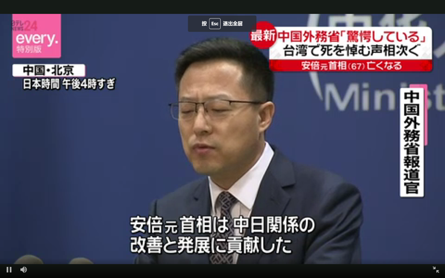 ▲日本电视台转播中国外交部发言人对安倍时间的哀悼与评论。