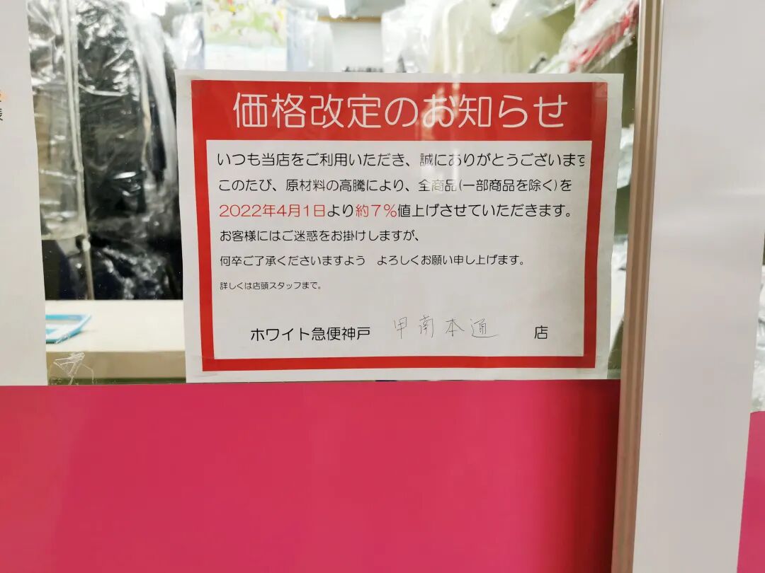 4月,日本关西地区一家干洗店贴出价格上调7%的告示。