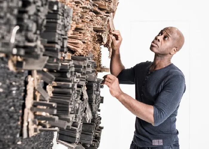 > Leonardo Drew在他位于布鲁克林的工作室里