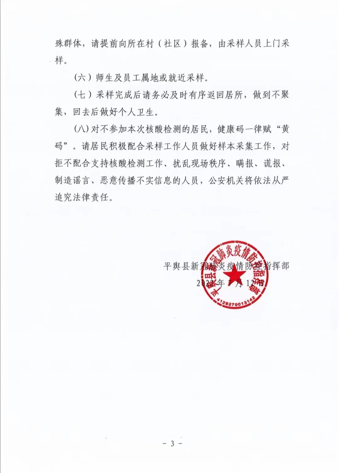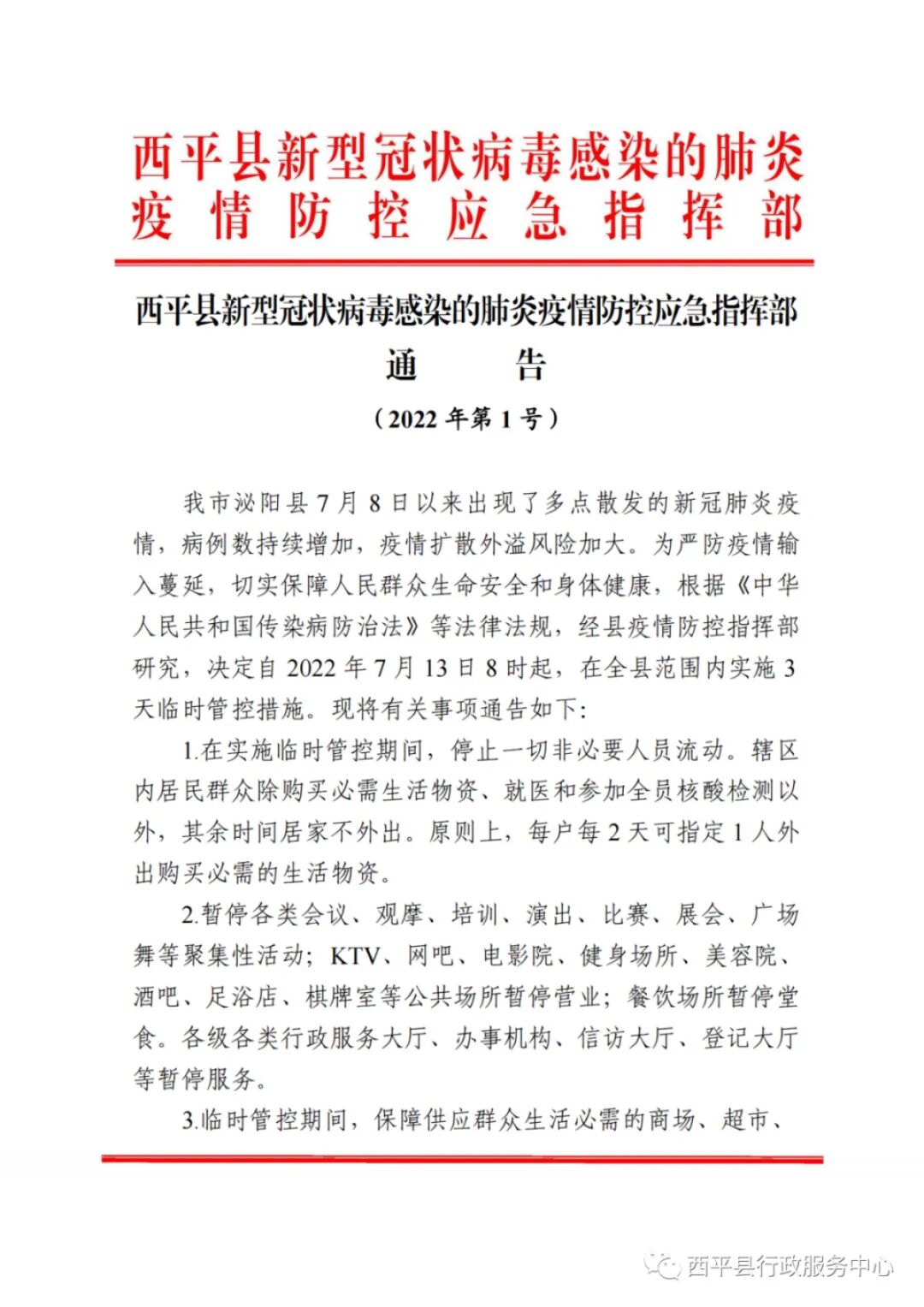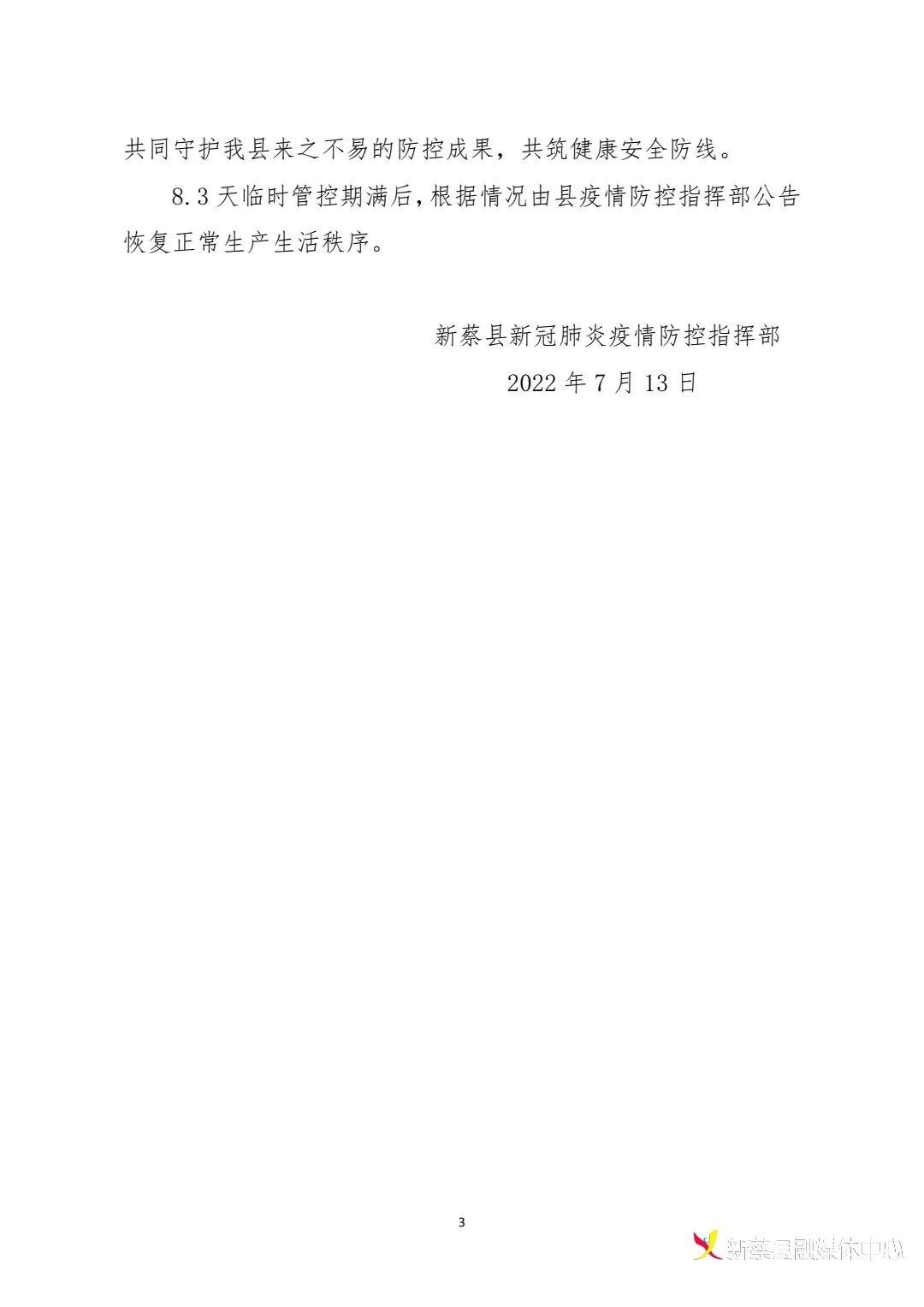 按照驻马店市疫情防控指挥部统一部署,为严防疫情发生 进一步传播扩散,切实保障人民群众生命安全和身体健康,经 县疫情防控指挥部研究,决定自2022年7月13日0时至2022年7月15日24时,在全县范围内实施3天临时管控措施。现 将有关事项公告如下: