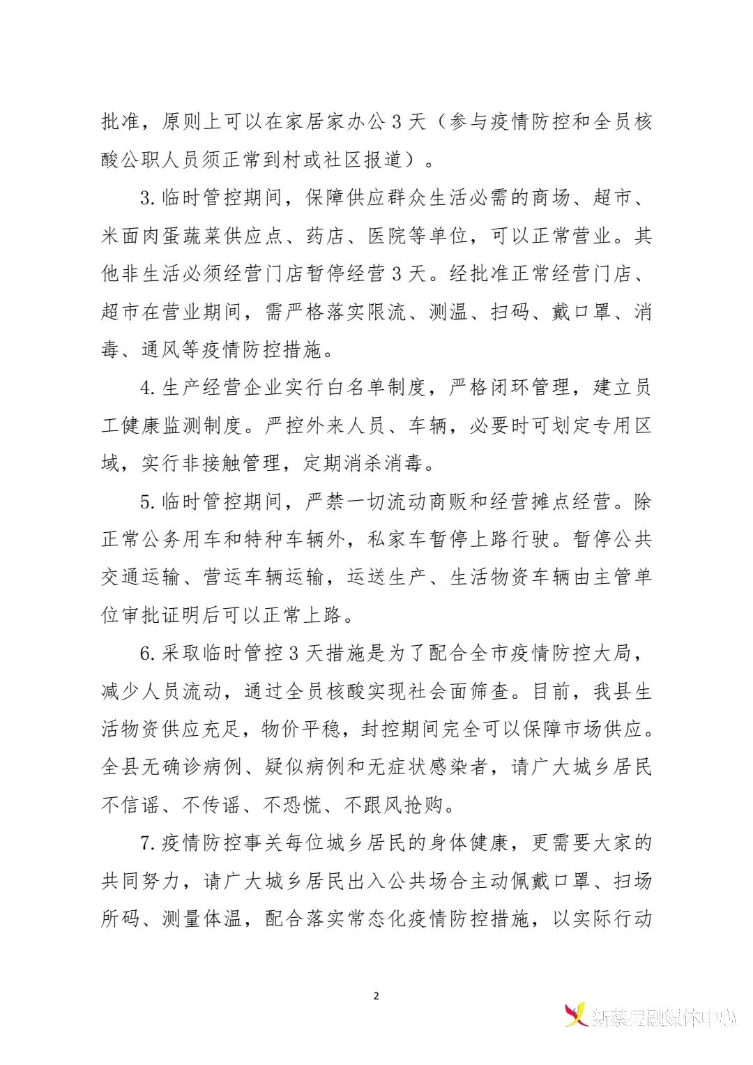 3.临时管控期间,保障供应群众生活必需的商场、超市、 米面肉蛋蔬菜供应点、药店、医院等单位,可以正常营业。其他非生活必须经营门店暂停经营3天。经批准正常经营门店、超市在营业期间,需严格落实限流、测温、扫码、戴口罩、消毒、通风等疫情防控措施。