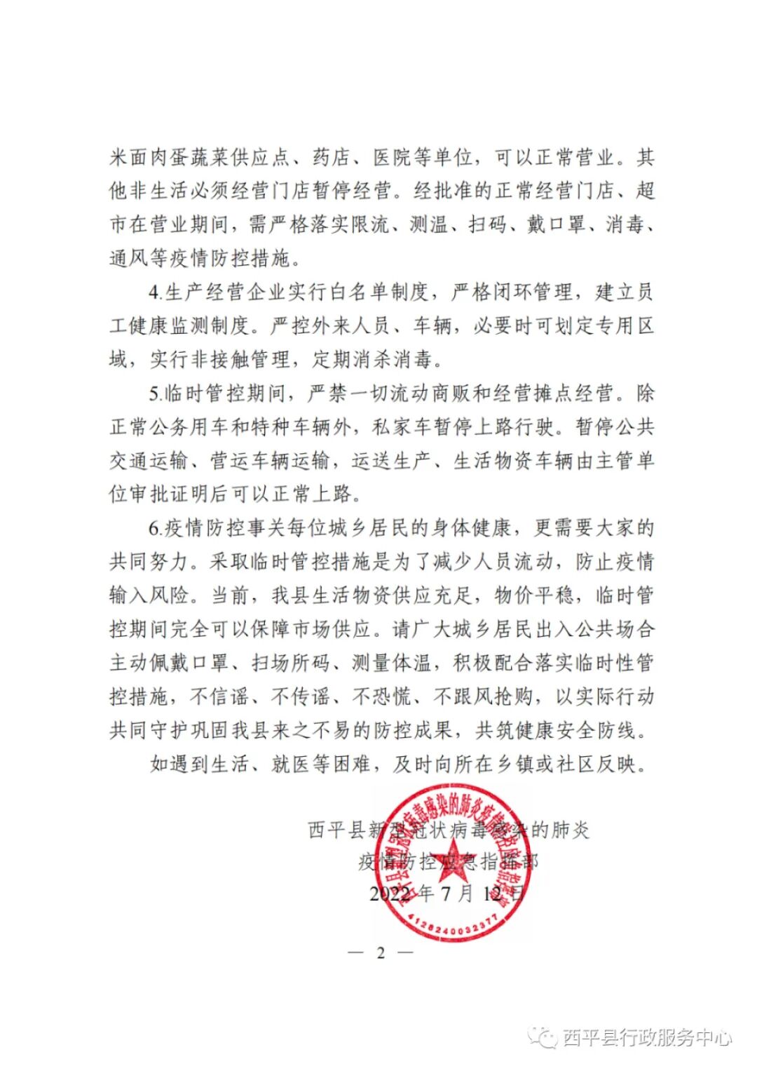 6. 疫情防控事关每位城乡居民的身体健康,更需要大家的共同努力。采取临时管控措施是为了减少人员流动,防止疫情输入风险。当前,我县生活物资供应充足,物价平稳,临时管控期间完全可以保障市场供应。请广大城乡居民出入公共场合主动佩戴口罩、扫场所码、测量体温,积极配合落实临时性管控措施,不信谣、不传谣、不恐慌、不跟风抢购,以实际行动共同守护巩固我县来之不易的防控成果,共筑健康安全防线。