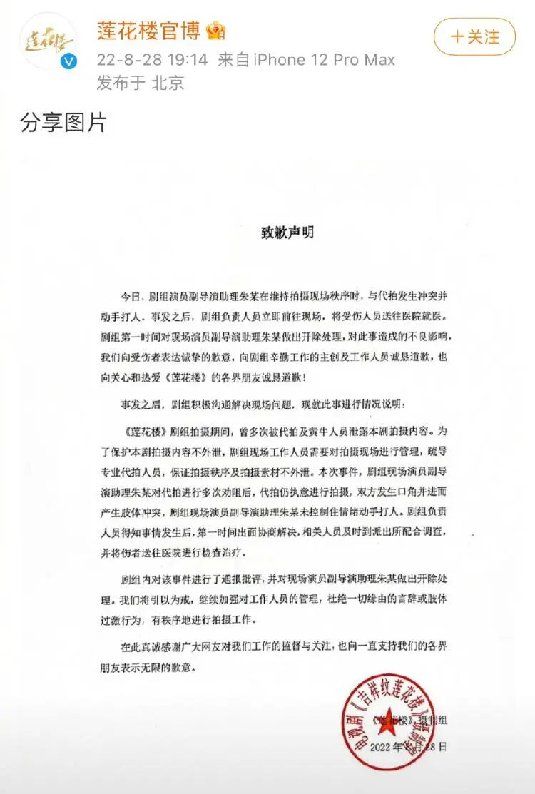 当日晚上,《莲花楼》剧组就打人事件发布致歉声明,对此事造成的不良影响向各界朋友致歉,称已将受伤人员送医,并第一时间开除了现场演员副导演助理朱某(打人者),相关人员已到派出所配合调查。声明称,朱某多次劝阻代拍无果后,二人发生口角并演化为肢体冲突,剧组之后会加强管理,“杜绝一切缘由的言辞或肢体过激行为。”