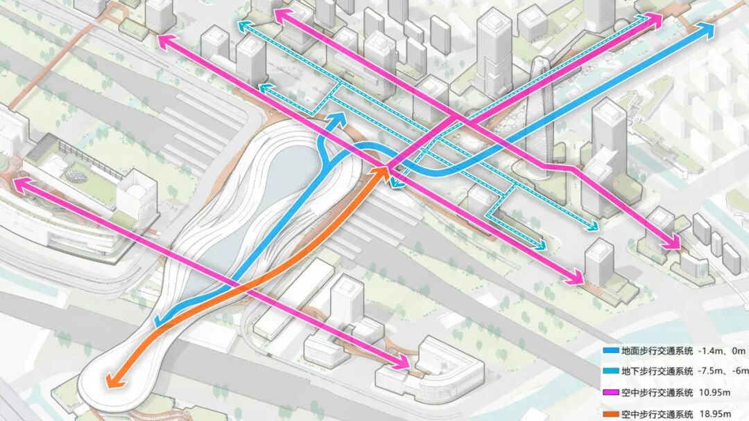 松江枢纽核心区采用多层次、网络化的车行交通布局结构,枢纽机动车交通利用高架道路与城市快速路连接形成快进快出系统,减少与地面交通的相互干扰。枢纽运营初期,以地面流线为主要的步行进出站交通组织方式,随着周围城市开发建设的逐步呈现,增设由地面、地下及空中三个层级组成的“丰“字形立体步行交通体系。