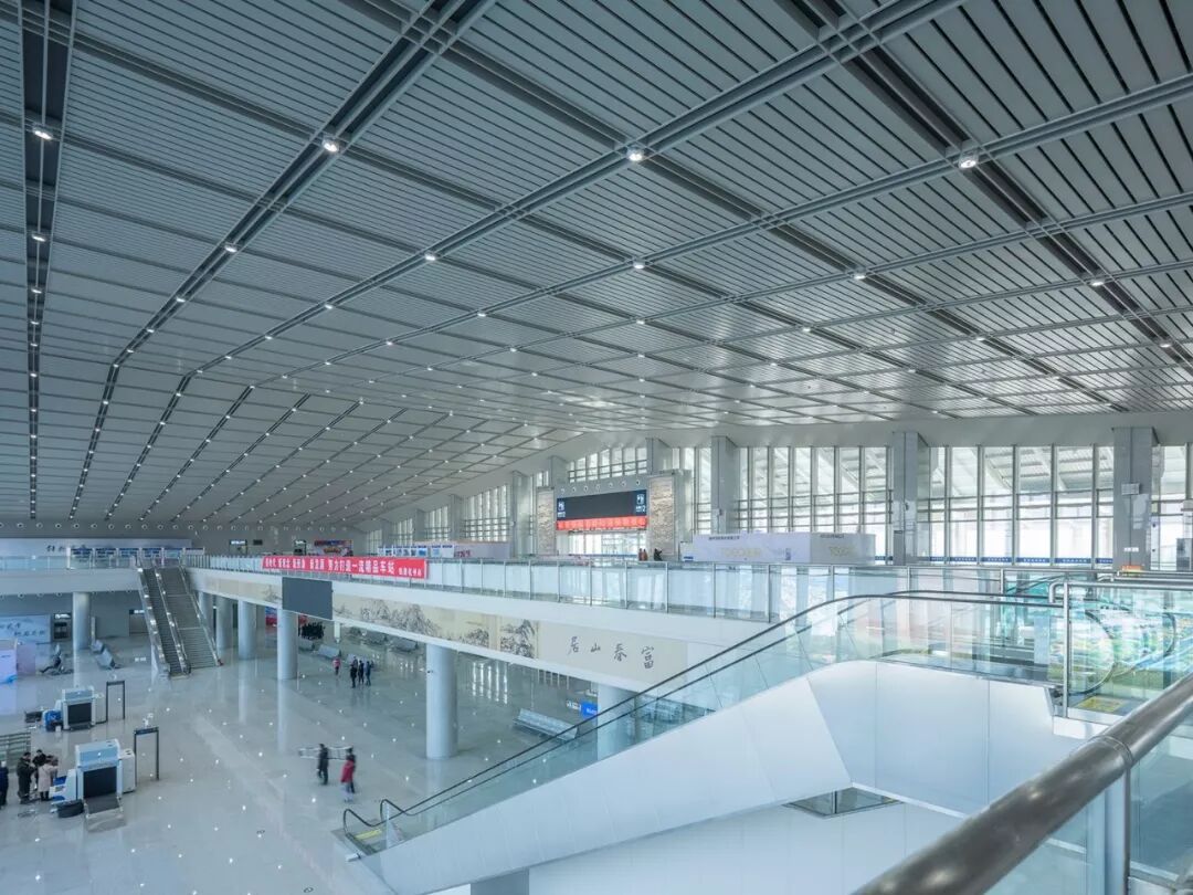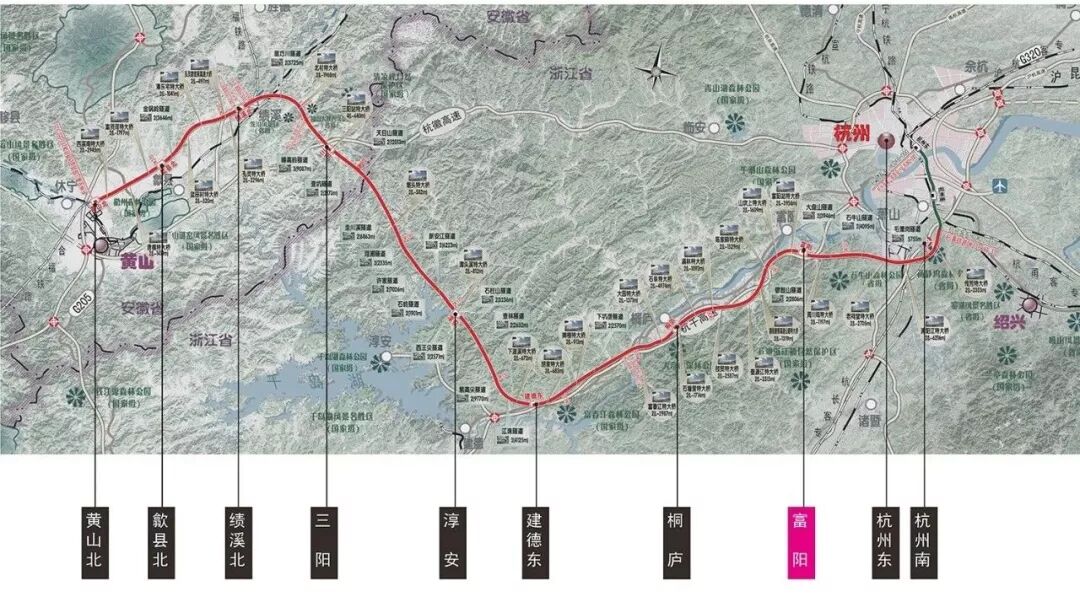杭黄高铁东起浙江杭州,向西经杭州富阳区、桐庐县、建德市、淳安县,进入安徽省绩溪县,终至黄山市直至安徽黄山,全线共设杭州东、杭州南、富阳、桐庐、建德东、千岛湖、三阳、绩溪北、歙县北、黄山北10个站点。筑境设计浙江省大师王幼芬主创设计了富阳站。