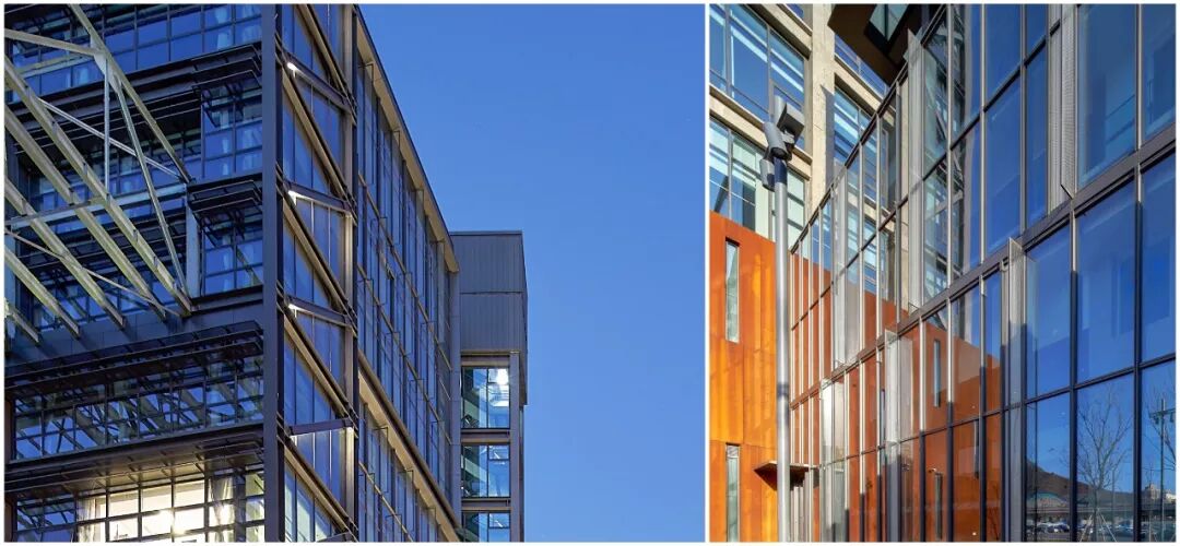 为了凸显工业构架的力量美,避免因为开启扇的凌乱弱化遗存与插建间的虚实体量,设计采用了垂直彩釉飞翼、水平遮阳百叶、折尺形玻璃飞翼和穿孔板等多种遮蔽方式以及双层幕墙空腔及内天井排风等手段,希望外墙开窗尽可能消隐。但事与愿违,办公楼的使用方希望多数房间可以直接在幕墙上手动开窗,这较大颠覆了原有开窗系统,对立面效果有一定影响。