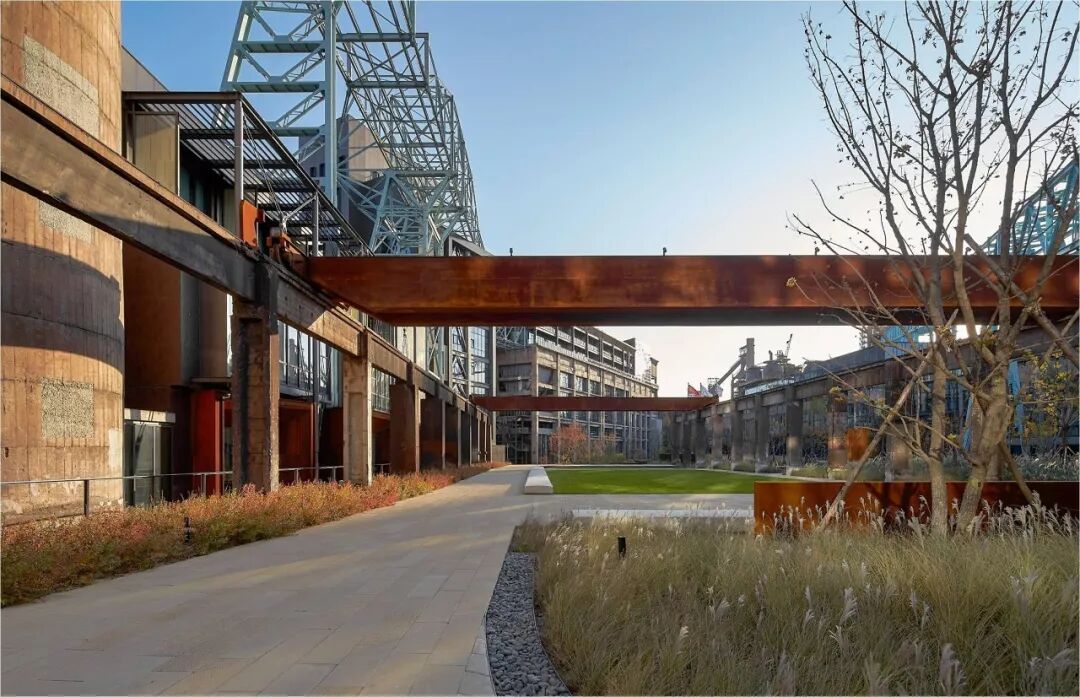 设计在几十乃至上百米的工业尺度和精巧的人体工程学尺度之间植入了一到两层的中尺度新建筑,锈蚀耐候钢门头、玻璃门厅和边庭、遮阳棚架等建构筑物尽力弥合了原有大与小尺度的差异。保留的锅炉房小水塔改造的特色奥运展厅和干法除尘器前压差发电室改造的咖啡厅等一系列和人性尺度相关的小尺度建筑也为园区塑造细腻丰富的尺度关系增添了精彩的亮色。