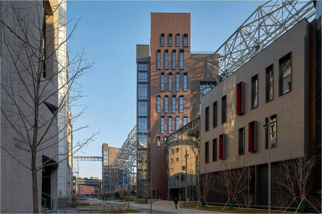 设计师为园区设置了一条穿行于建筑之间和屋面的室外楼梯+栈桥的步行系统,这为整个建筑群在保持工业遗存原真性的同时叠加了园林化特质。整组建筑就是一个立体的工业园林,步移景异间,传递出一种中国特有的空间动态阅读方式。