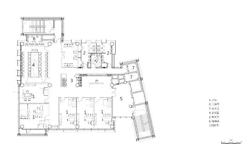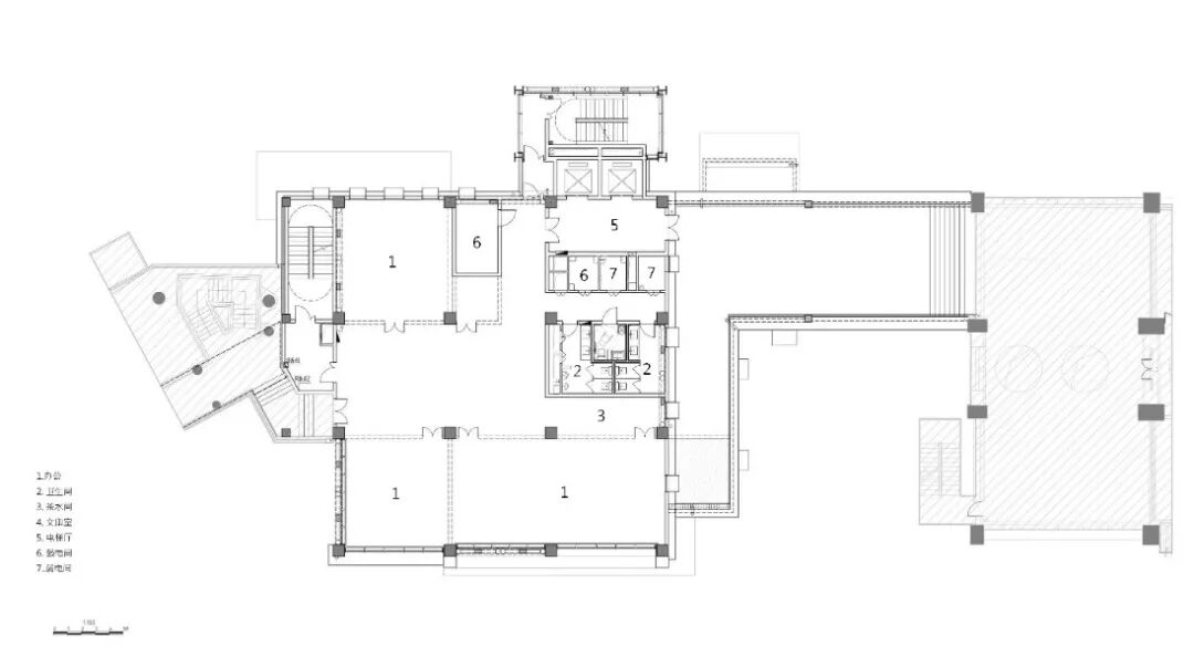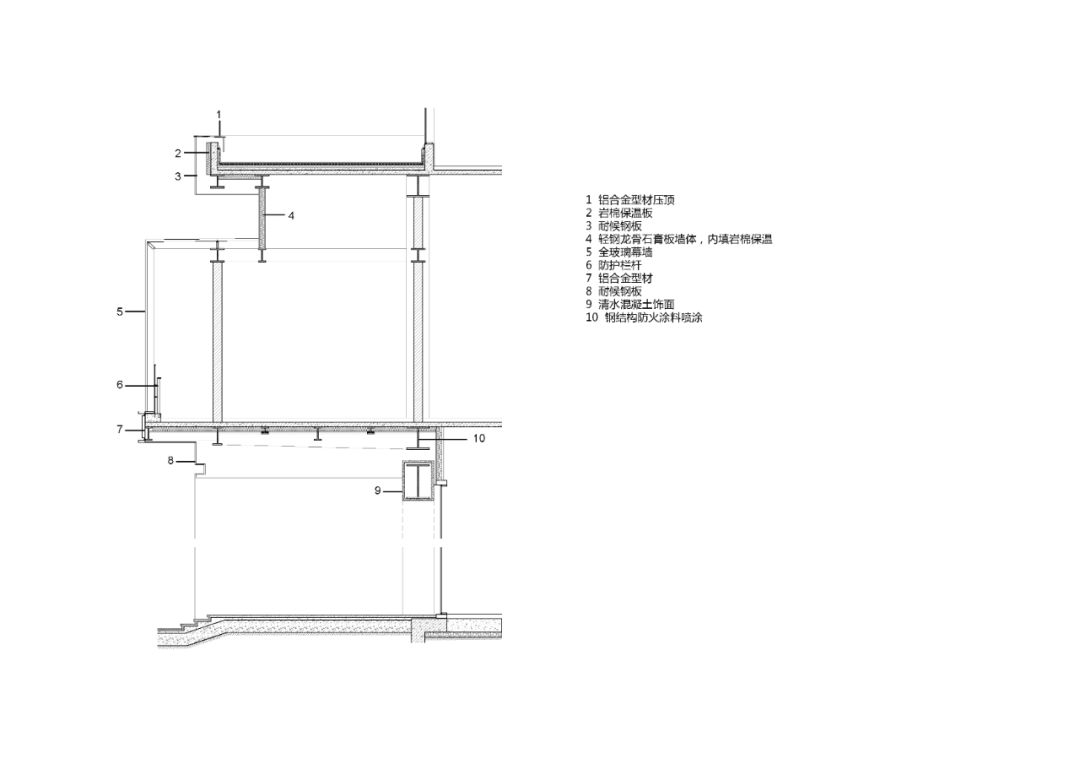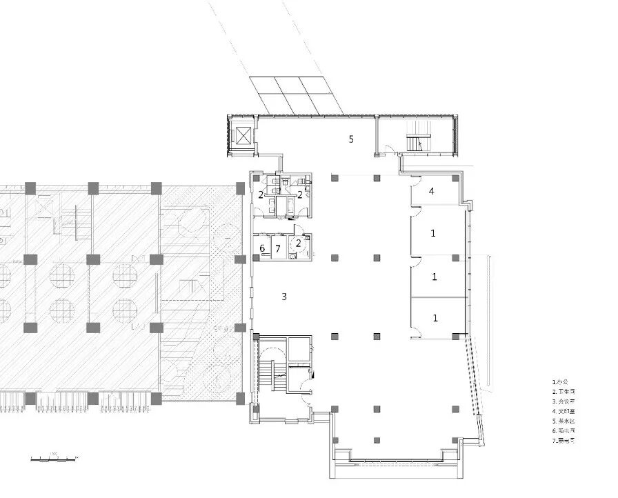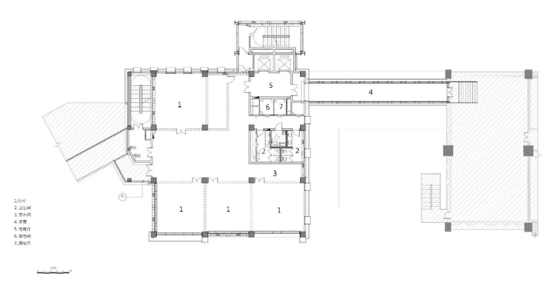 在谨慎保留原有建筑钢结构和混凝土结构的基础上,设计保留原有结构空间作为主要功能空间使用,交通核服务空间以钢框架外置。这样,建筑造型忠实呈现出了“保留”和“加建”的不同状态,表达了对既有工业建筑的尊重。