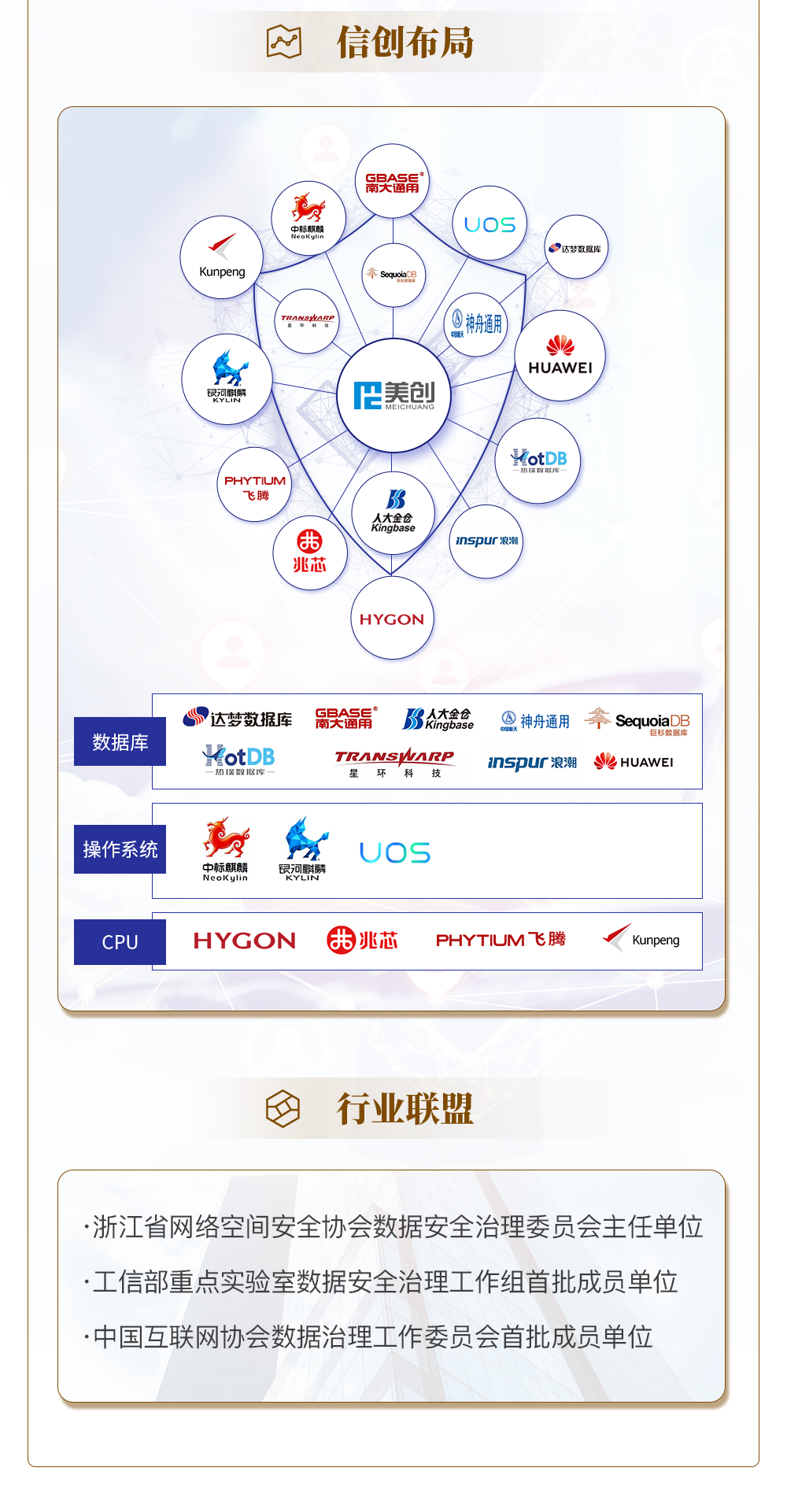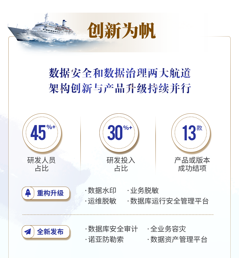 功能介绍 美创科技,以“数据安全领导者和引路人,数字化转型推动者”为使命,围绕数据安全、数字化转型、运行安全三大业务,为政企用户提供专业产品与解决方案。