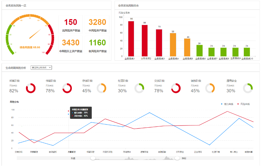 针对单位组织数据生命周期各阶段活动,数据安全综合评估系统可依据前置数据采集和分析结果,自动完成生命周期各阶段的风险分析,生成数据资产的全面风险清单和风险预估,同时评估完成后可自动形成可视化报表,如下图所示:
