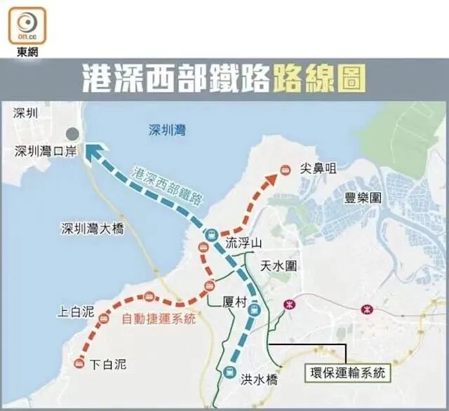 “港深西部铁路” — 连接洪水桥和前海,便利港深往来,促进香港与大湾区融合发展、互联互通;