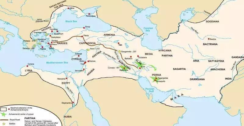 阿契美尼德王朝,又称波斯“第一帝国”。公元前559年由居鲁士二世,也就是我们常说的居鲁士大帝世统一波斯,建立阿契美尼德王朝。居鲁士二世击败了当时统治波斯的米底人(Median),使波斯成为一个强盛的帝国。前539年,居鲁士占领巴比伦。到了大流士一世,帝国疆域得到了空前的发展,成为世界历史上第一个地跨欧亚非的三洲大帝国,他陆续征服和入侵了世界五大文明发祥地中的四个(两河流域、印度河流域、埃及和希腊),极盛时期版图达850万平方公里,人口达当时世界总人口的44.48%。