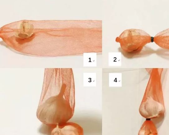 只需大蒜放入鸡蛋网套中,打个结后再放入另一个大蒜。