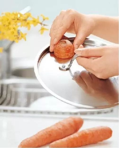 首先将洗洁剂倒一点在有油渍的锅盖上,再用胡萝卜头来回擦拭,约莫擦好后,最后用干净的湿抹布将其表面擦拭一下即可,会有意想不到的效果哦!