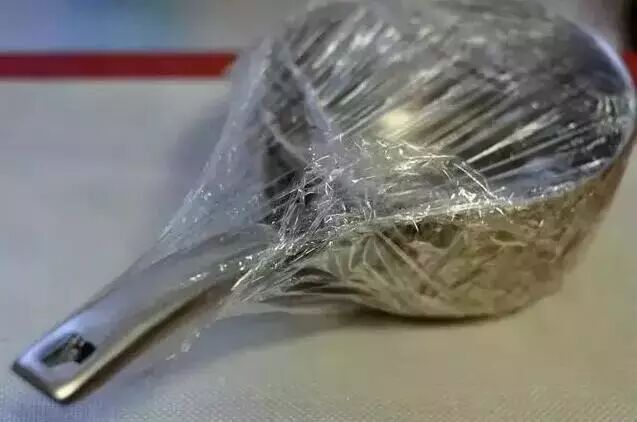 3、锅抹上小苏打以后,再用保鲜膜将整个锅包起来,对于底部也有污垢的锅,大家可以剪一块保鲜膜贴住。这个原则是让锅具和小苏打充分接触混合子啊一起,隔离了空气。