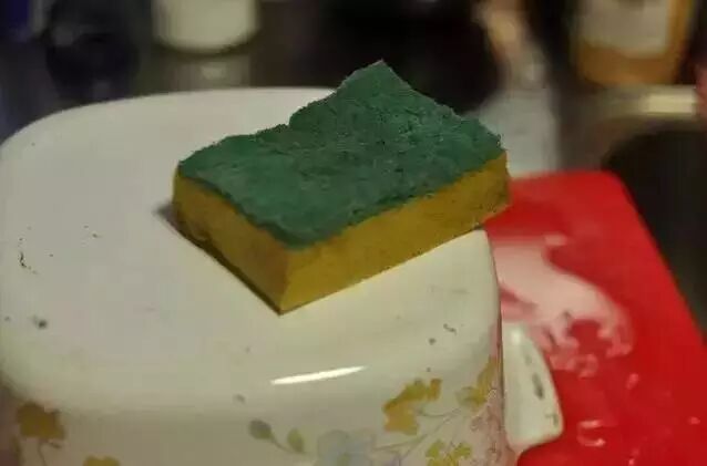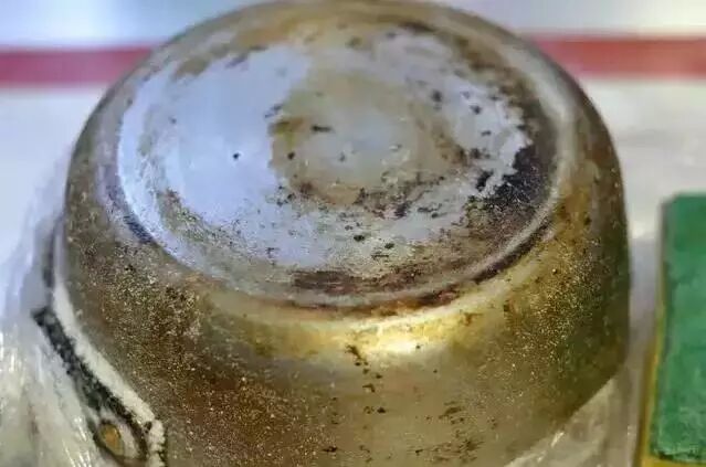 5、第二天,将保鲜膜撕下来,直接用百洁布擦洗,这时候所有的污垢都自动脱落了,整个锅焕然一新,非常干净。