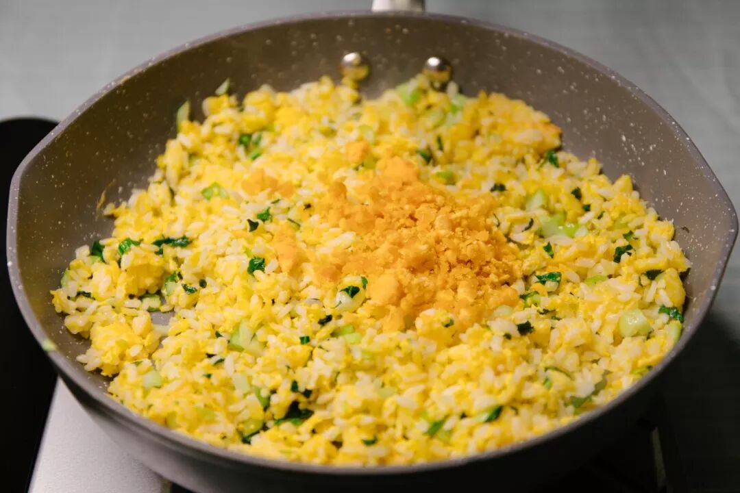 ⑥ 将咸蛋黄碾成碎末,一同倒入锅中炒匀,金灿灿的赛螃蟹炒饭get。