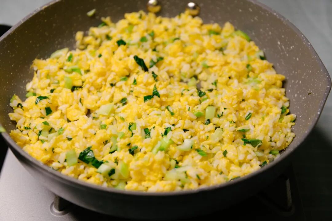④ 锅中热油,倒入拌好的米饭蛋液,中火翻炒至蛋液收干;