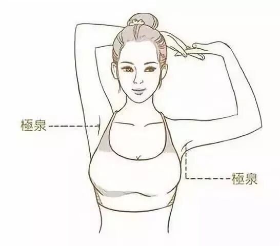 首先一只手叉腰,这时腋窝是深陷进去的,然后用另一只手在腋窝的最深处去按揉它,揉到这里发热,一般5~10分钟然后换到另一侧10钟。