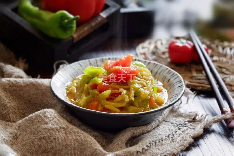 1、将茄子去皮,切成细丝。番茄去皮,切成小块。尖椒切成丝。姜切末。