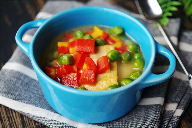 4、锅内倒入适量素高汤烧沸,加入豆腐丁