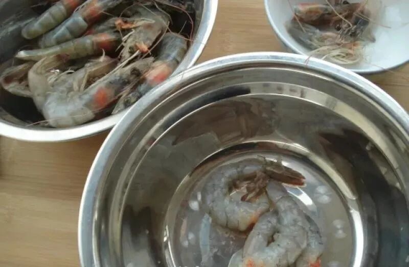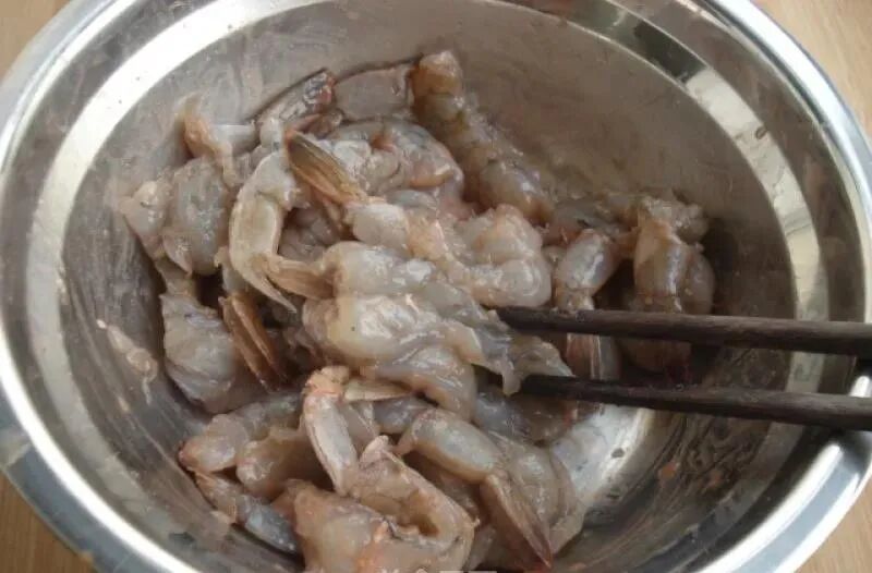 1. 虾去掉头、壳,挑去虾线,从虾腹部剪开。