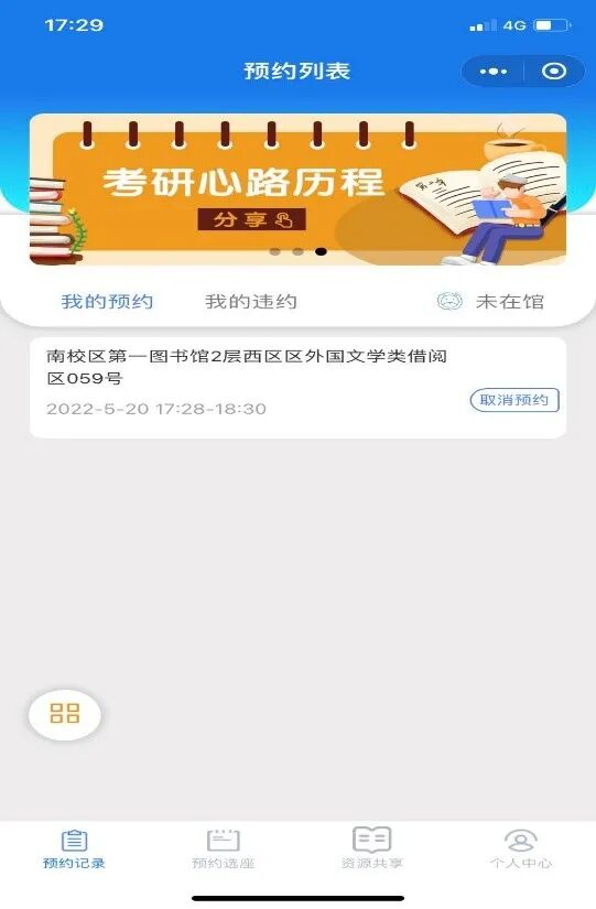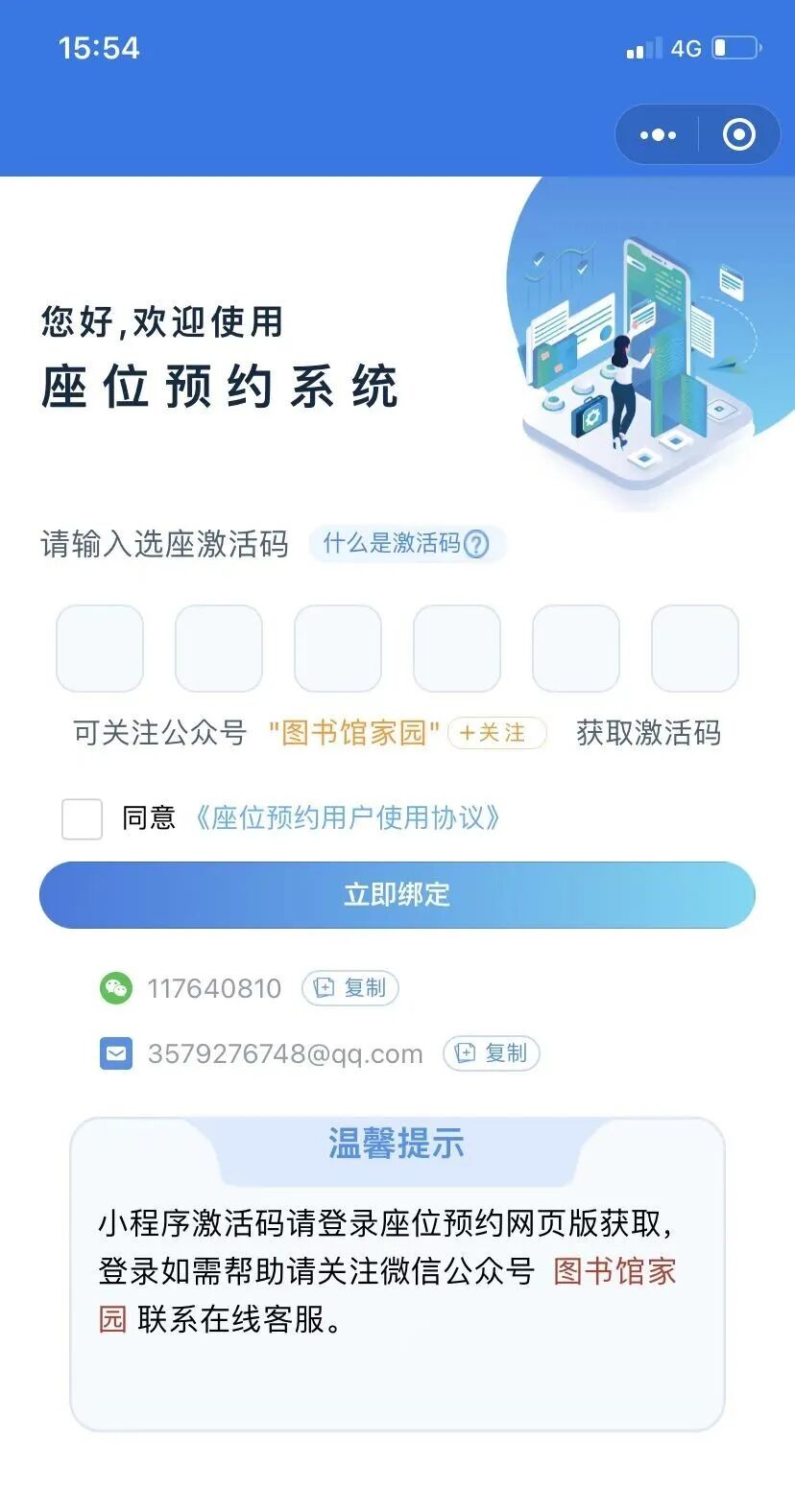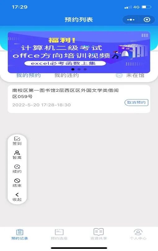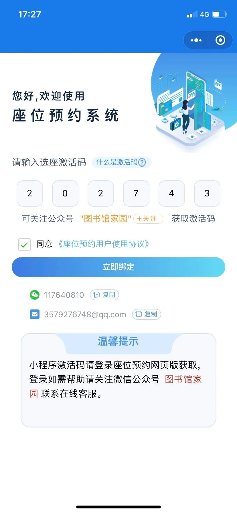 绑定后进行小程序,即可进行预约座位、签到、暂离等操作。