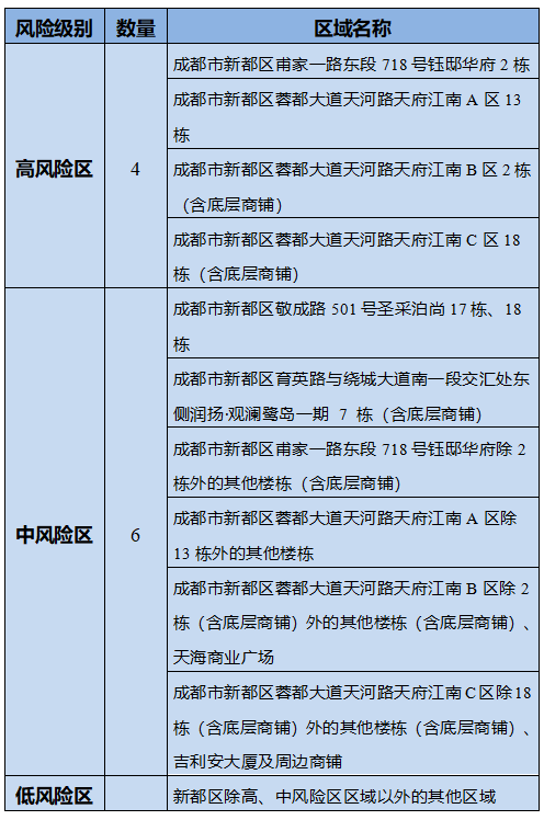 自2022年7月26日起,将成都市新都区育英路与绕城大道南一段交汇处东侧润扬·观澜鹭岛一期 7 栋(含底层商铺)的风险等级由高风险调整为中风险,将成都市新都区育英路与绕城大道南一段交汇处东侧润扬·观澜鹭岛一期除 7 栋外的其他楼栋(含底层商铺)的风险等级由中风险调整为低风险。调整后的新都区疫情风险区域详见附表。