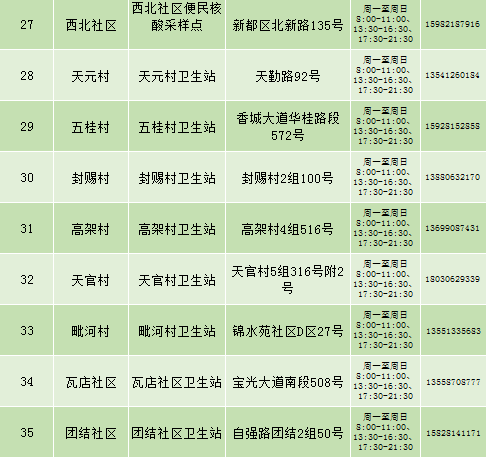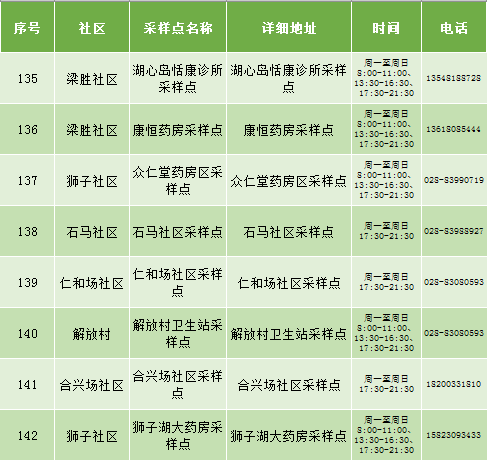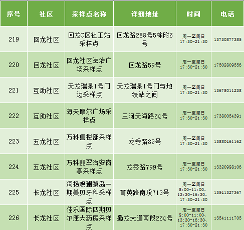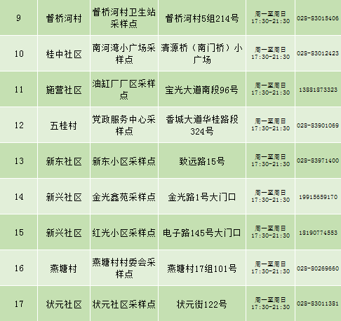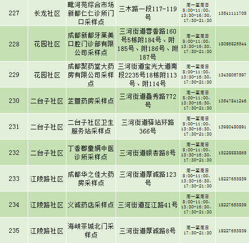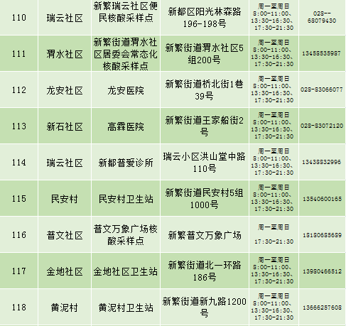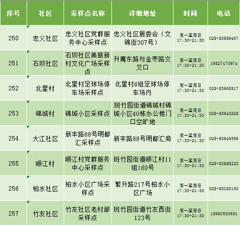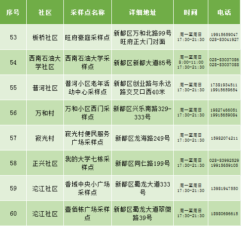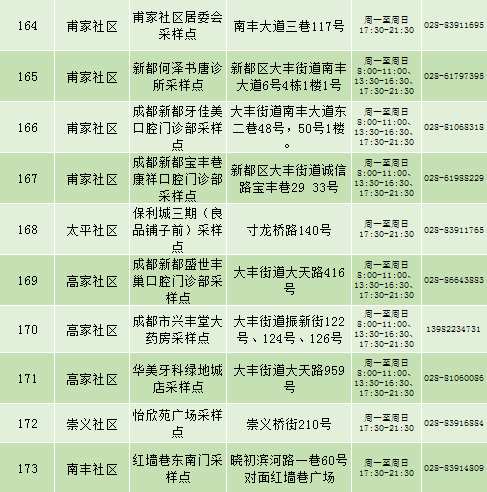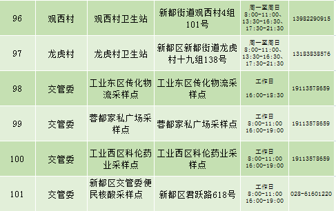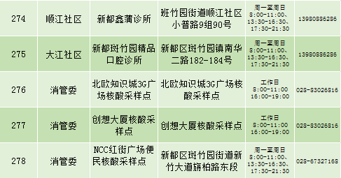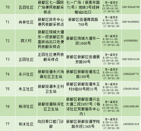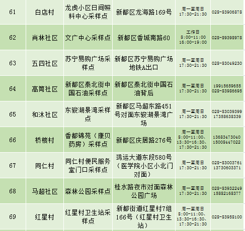 根据疫情防控需要,9月25日新都区公布最新核酸检测点位及时间,为满足广大市民核酸检测需求,共设9个黄码检测点、310个便民核酸采样点(含9个24小时便民采样点、18个08:00-24:00便民核酸采样点、283个社区便民核酸采样点),为市民提供免费混检服务。