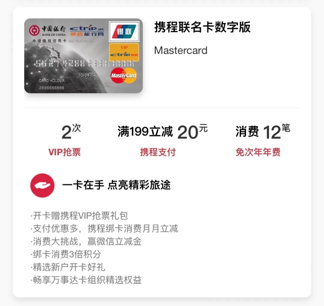 为了助力同学们享受更精彩的旅程,中国银行万事达携程联名卡数字版焕新升级上线!只需5步即可使用数字卡,即申即可激活开卡使用。现在申请还可以享受携程VIP抢票礼包+消费月月减+赢微信立减金+消费3倍积分+新户开卡好礼+卡组织精选权益,六重重磅权益等你来拿。![]()