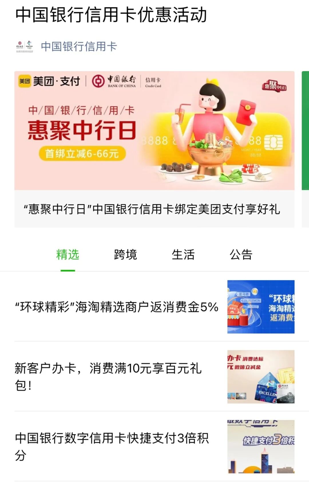 除此之外,中国银行信用卡还有巨多信用卡活动给同学们,关注中国银行信用卡微信公众号,热门活动栏目里面一目了然,生活、海淘多个场景优惠。