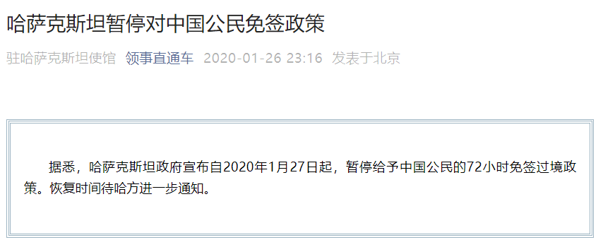 疫情前,哈萨克斯坦对中国游客采取的是过境72小时免签的政策。即乘坐阿斯塔纳航空,在阿拉木图或努尔苏丹转机,可以过境免签72小时。但2020年初,新冠疫情开始后,哈萨克斯坦几乎是第一时间暂停了这个政策。