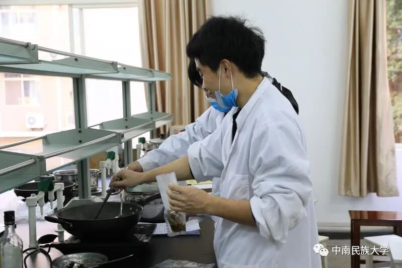 食品质量与安全专业大三学生刘畅和组员把去过血水的牛肉放入煮有八角、花椒、桂皮等香料的卤水中,锅里的牛肉在卤汁中咕噜咕噜地翻腾着,散发出令人垂涎的香味。