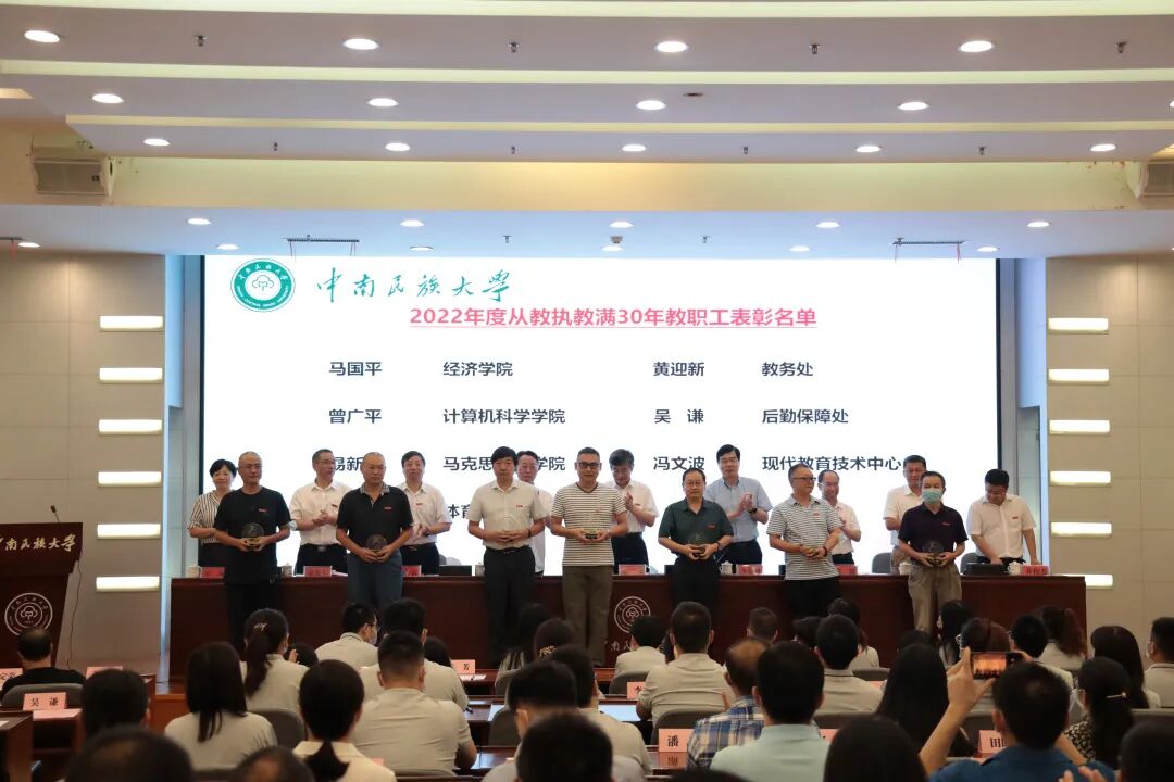 校党委副书记、副校长宋发军宣读了表彰决定。易新涛等19名从教执教满30年的教职工、夏晋等10名2022年度“三全育人”楷模、杨帆等19名获省部级及以上荣誉的教师、民社学院民族学教研室等3个获省级优秀教学组织的教研室、李超锋等14名获教学标兵或教学先进个人的教师、龙浩等10名获“十佳青年教工”的教职工受表彰。校党委常委为受表彰教职工及教研室代表颁奖。