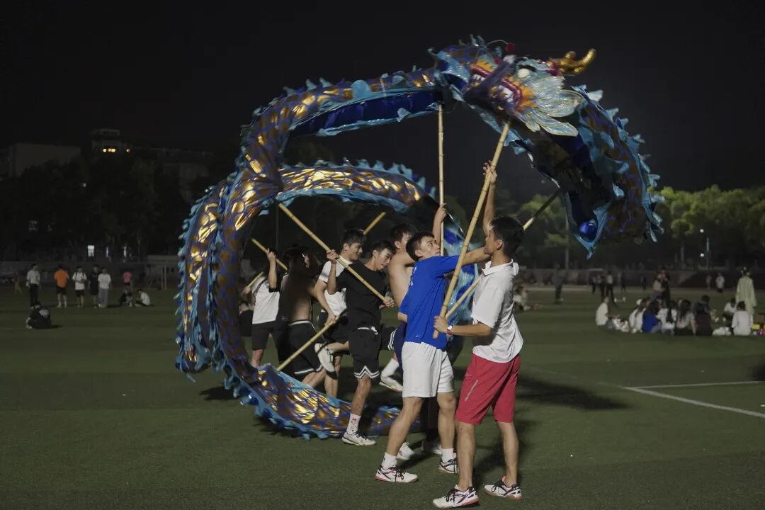 “一二三,变!” “首尾盘柱” “螺旋跳龙一个,五个!”舞龙舞狮队队长李酉凯熟练地提醒着队员变换造型。“我位于龙头的位置,是整个龙体的核心,在舞龙的过程中,我需要记住整套动作的路线和每个环节的动作,随时提醒着队员们准备变换动作。”台上一分钟,台下十年功。为了筹备比赛,舞龙队每周周五至周日晚都会在南湖操场训练,以确保每个队员都能将动作套路做到熟练且规范。