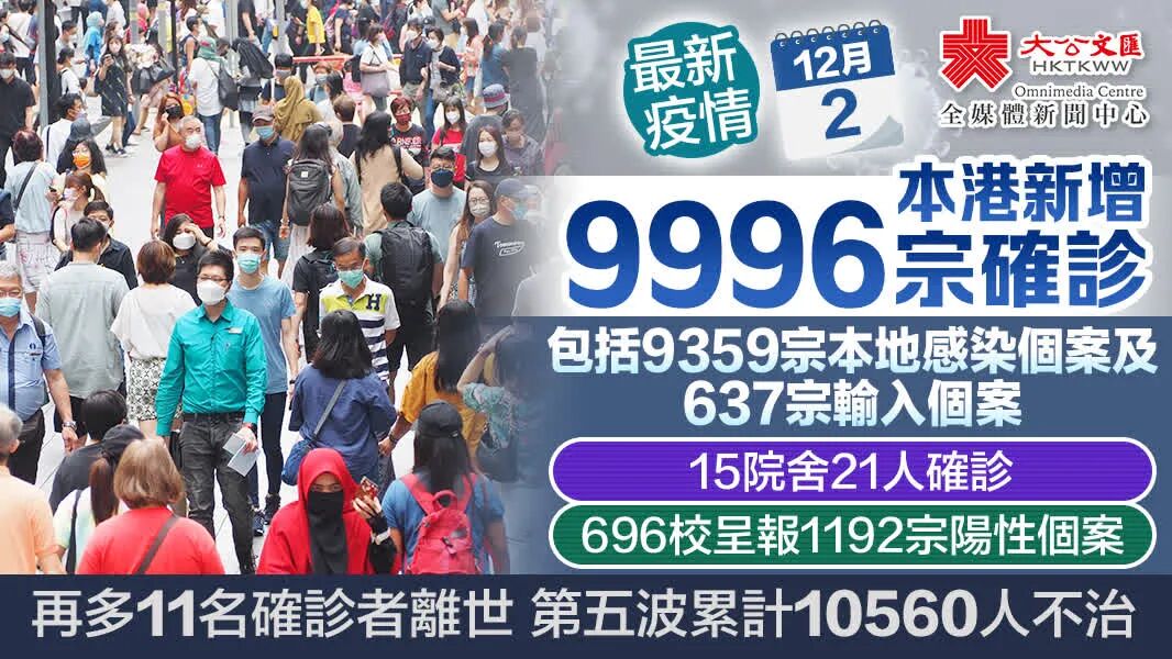 5.香港過去一日新增9996宗確診個案。一名5歲男童,懷疑在染疫後因併發腦水腫危殆,最終不治。6.香港過去一周新增一宗類鼻疽感染確診個案,涉及一名70歲女子,患有糖尿病,居於長沙灣元州街。7.政府向立法會提交《跨越2030年的鐵路及主要幹道策略性研究》文件,初步研究興建「三鐵三路」。8.有市民向《大公報》投訴華滙中心外牆設眾多閉路電視攝錄鏡頭。立法會議員葛珮帆指,無錄影告示涉違反私隱條例。9.一男子疑因不堪照顧失禁89歲老父長期壓力,弒父後縱火焚屋,雙雙殞命。社工倡各區設支援站為基層家庭照顧者紓困。
