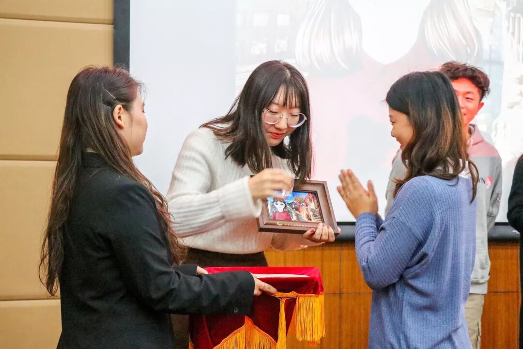 随着开场视频《团聚英才·薪火相传》的放映,大会宣告开始。在奏唱中国共产主义青年团团歌后,九位离任学生干部李响、曲秀杰、徐鹏、孙鑫昊、王函和张誉等在离任干部纪念视频《山高水阔 源远流长》中亮相,离任干部代表曲秀杰发表离职感言,回忆了一年来在共青团工作中难忘的点滴,表达了对共青团组织的感激与不舍之情,感情真挚,令在场的团干部们为之动容。在悠扬的音乐中,校团委老师们依次为离任的干部们颁发了纪念礼物,喂上一口离别的饺子并祝酒拥抱,祝愿他们在未来的工作学习中一帆风顺、再创佳绩。