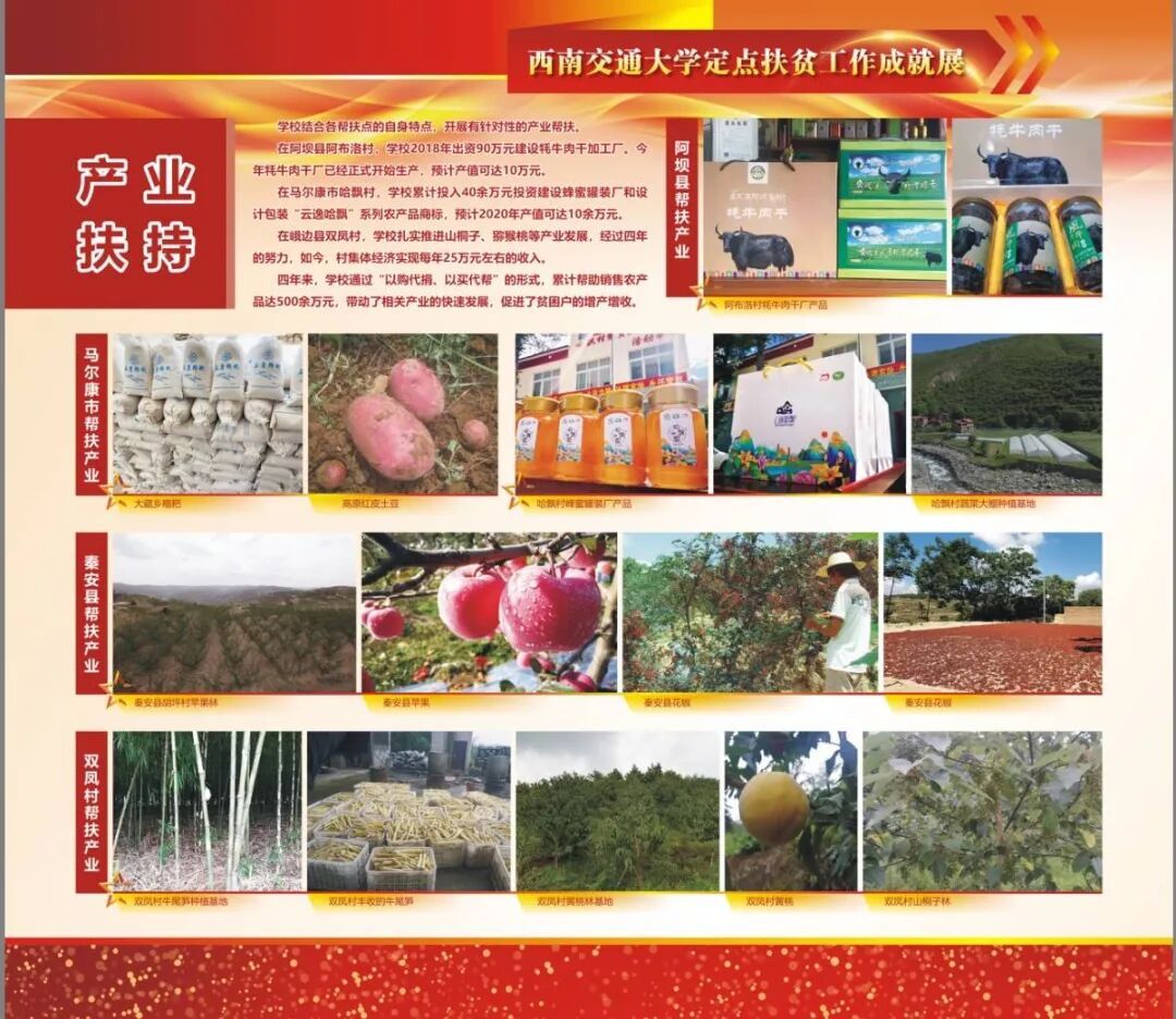 本次工作成就展包括西南交通大学定点扶贫工作成就展、西南交通大学援藏成就展和西南交通大学援疆成就展,吸引了众多师生驻足观看。现场供应土豆烧牛肉大餐,2万斤来自马尔康的生态土豆、10头来自马尔康、阿坝县的牦牛将在学校食堂持续供应;现场试吃土豆、苹果、鸡蛋、鸭蛋;4个帮扶点26种农产品展示……交大师生用自已的实际行动助力脱贫攻坚、贫困户增产增收。