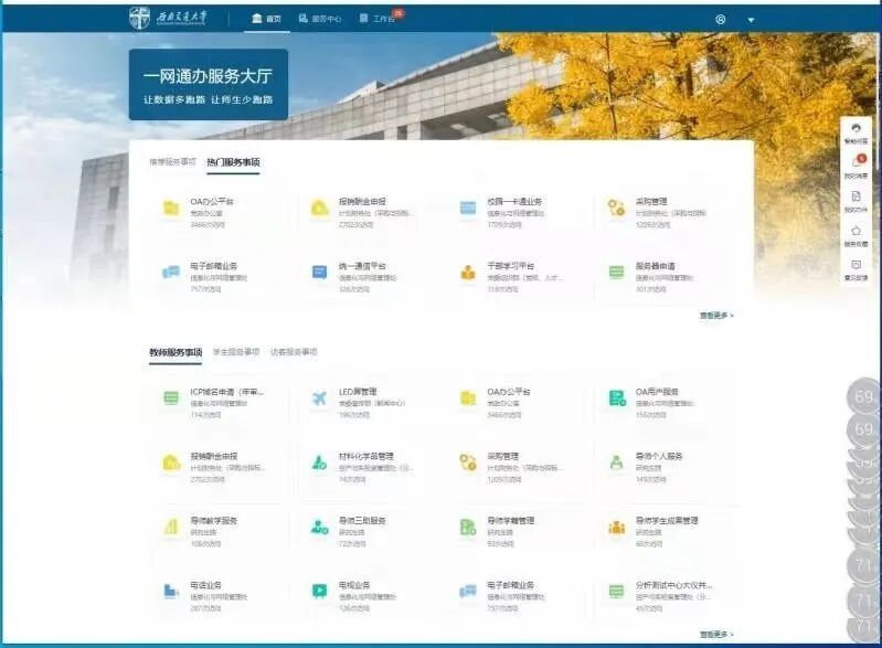 打头阵的“热门服务事项”,根据全校师生的访问数实时排序,方便大家快速锁定想要办理的业务。如果觉得“热门服务”的推荐不符合你的实际需求,还可以将鼠标悬浮到选项卡上、点亮收藏的小星星,让它变成你的专属个人收藏。