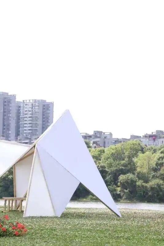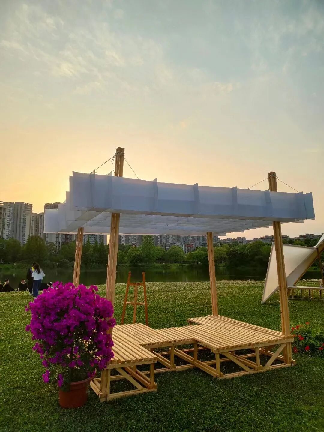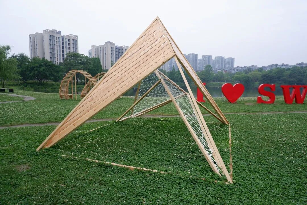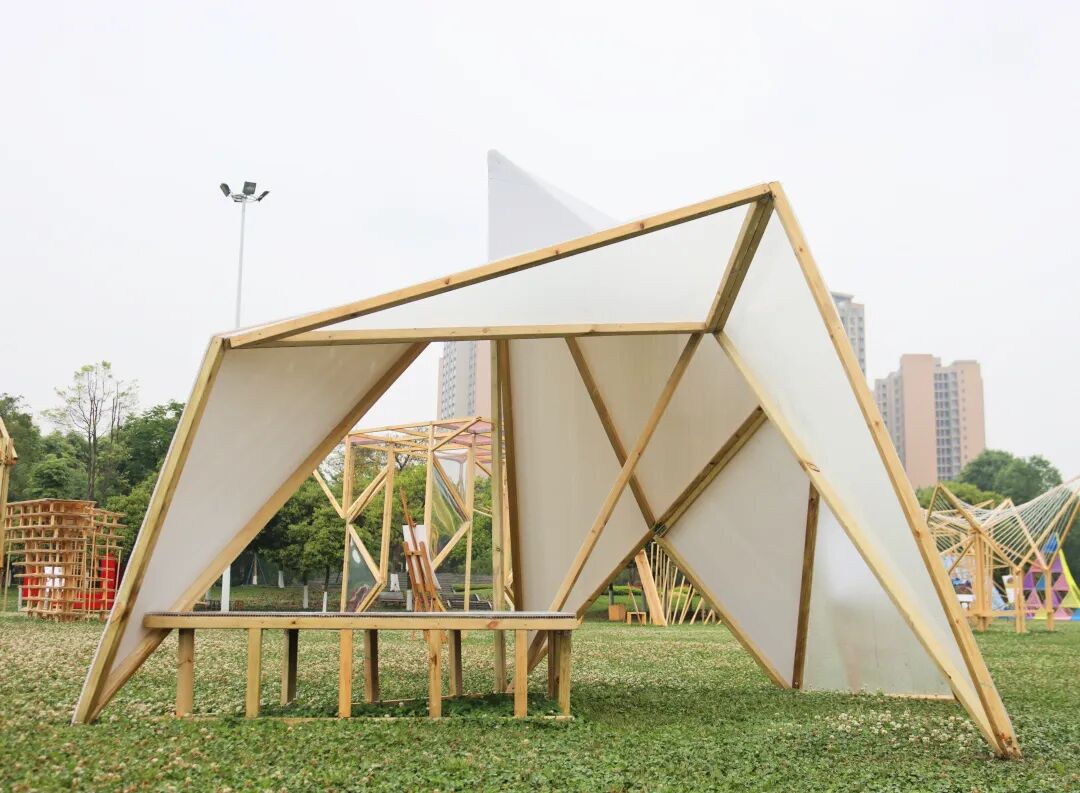 本次“建造节”以“运动驿站”为主题概念,来自全校土、机、电、地、智、设各学院的学生与建筑学子协力参与建构活动 。历时半个多月,同学们有条不紊地将作品的概念构思落实到室外搭建中,终于迎来了最后的展示与检验。