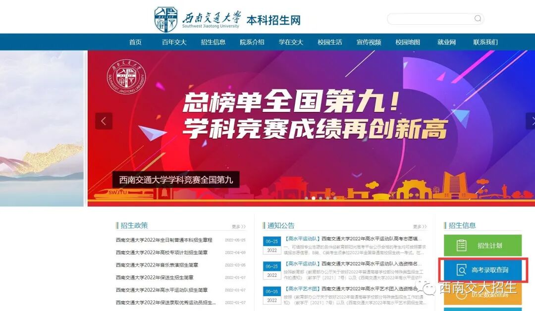 登录“西南交通大学本科招生网”,点击“招生信息”——“高考录取查询”。在如下界面输入考生号和姓名进行查询。网址:https://zhaosheng.swjtu.edu.cn/