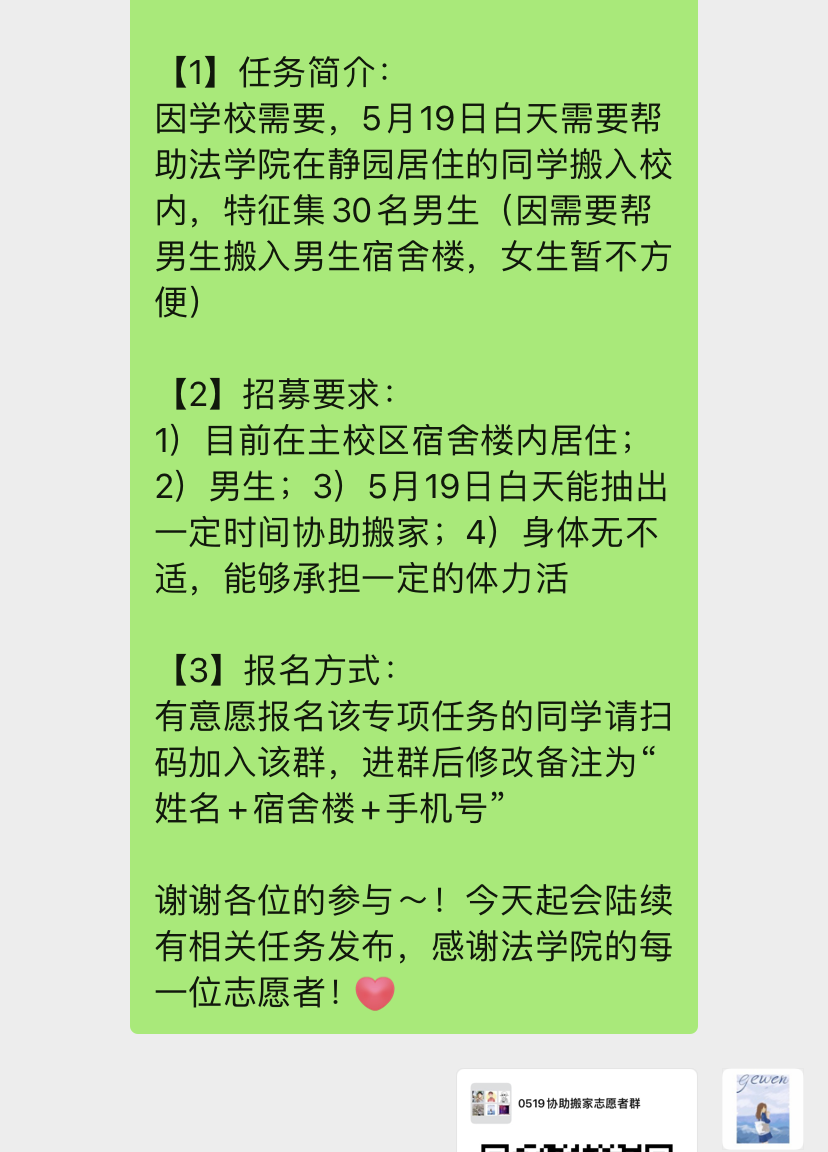 为响应学校防疫工作安排,保障同学们转移住宿的顺利进行,最大程度降低同学们转移宿舍过程中的困难,法学院党员志愿服务队分两次分别组建三十人和十二人的专项工作志愿者小队,在党团委老师的带领下,协助居住在静园的同学于5月19日和5月22日有序搬离宿舍。