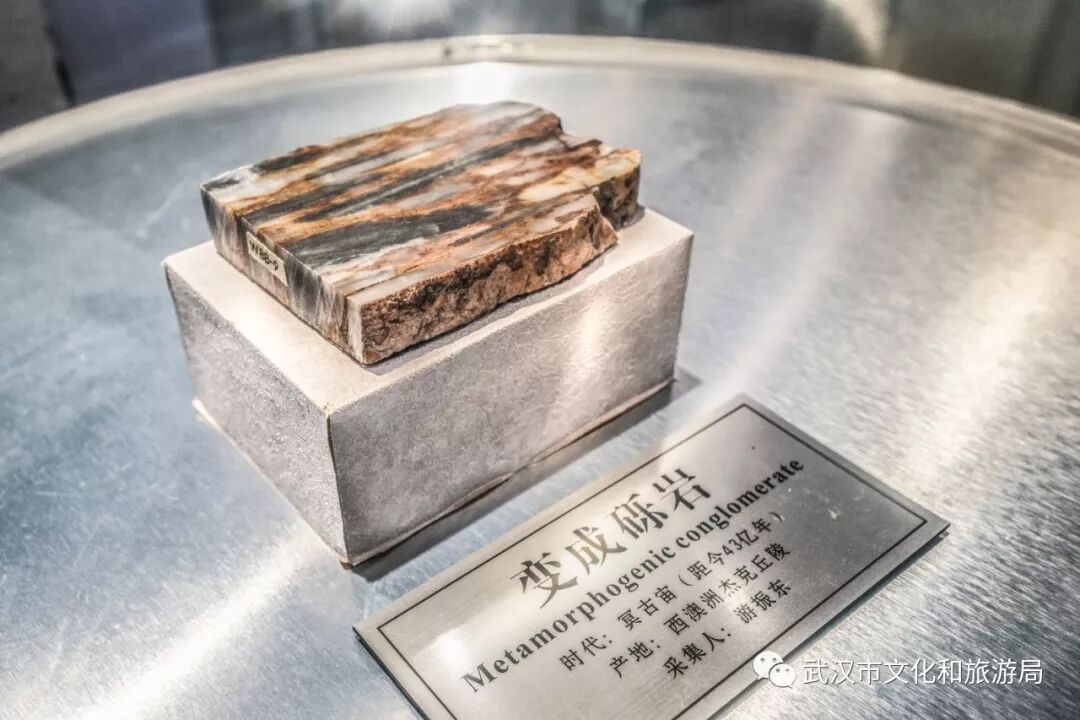 每一块其貌不扬的“石头”,在这都不容小觑。明星级的“镇馆之宝”,是这片100平方米的化石墙,出土于陕西北部,上面的动物足迹来自2亿年前的远古生物。旁边看似花岗岩的石头“变成砾岩”,竟和地球差不多同龄,43亿岁了。