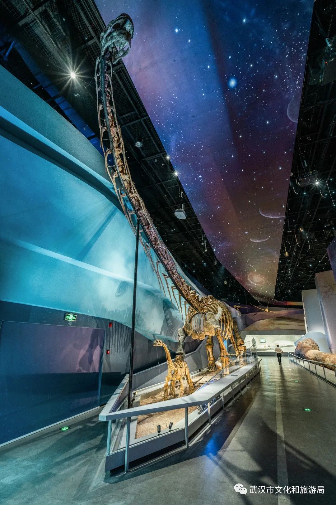 贝林大河生命馆里,藏着中国最大的马门溪龙,巨型骨架,19节颈椎(一般哺乳动物的颈椎为7节),足足两层楼高。