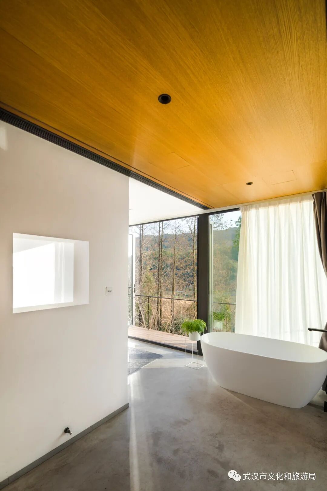 房间最左侧有扇迷你小窗,正对着竹林,苍翠欲滴的颜色衬着雪白的墙,躺在床上就能感受春天。