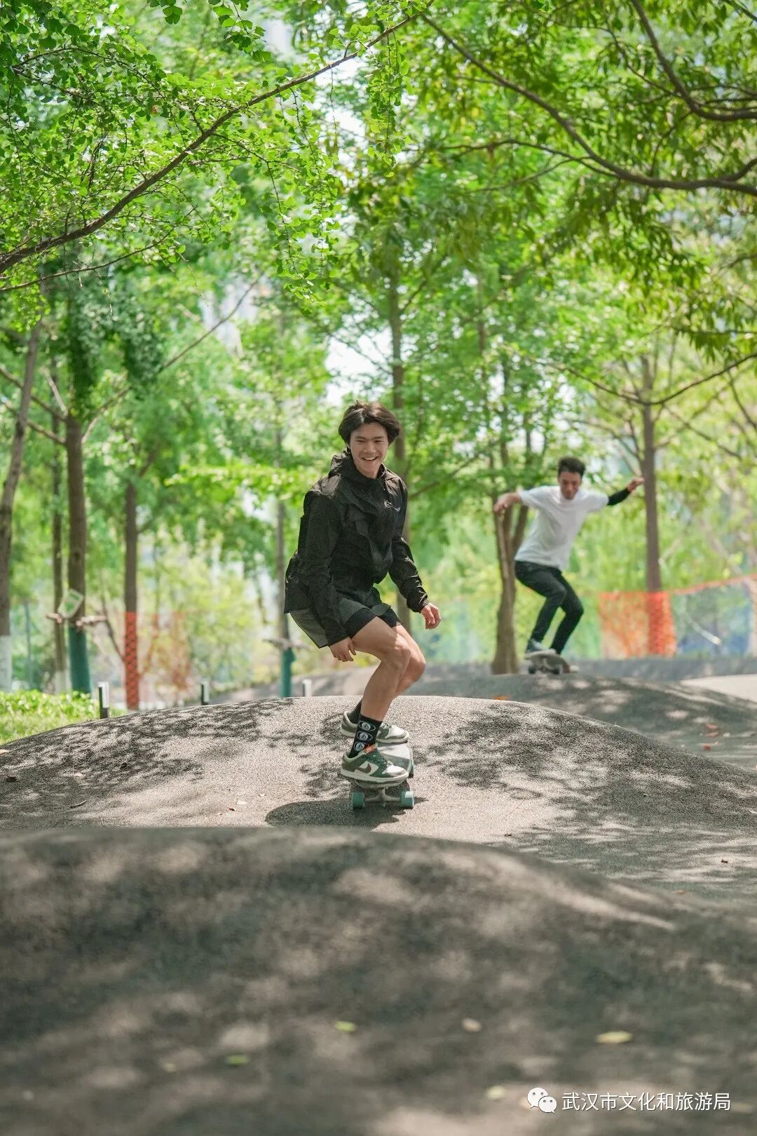 「森林滑道」藏身一片树林中,林间筑成了高低起伏的赛道,小朋友的平衡车、专业极限轮滑……都可以在这里嗨起来。